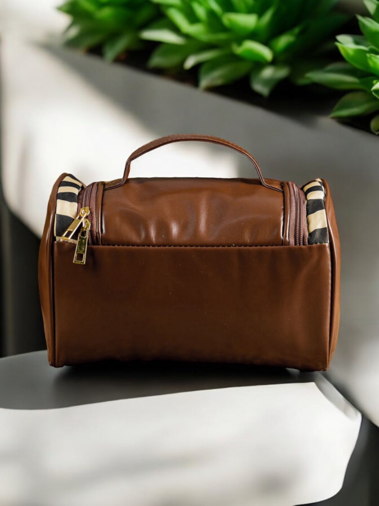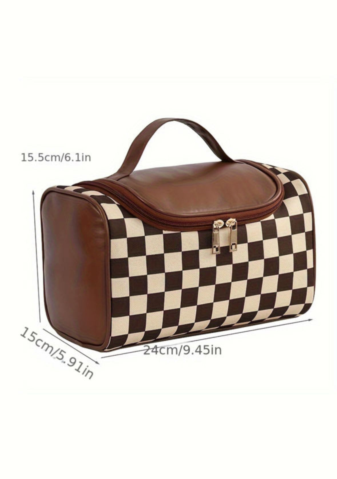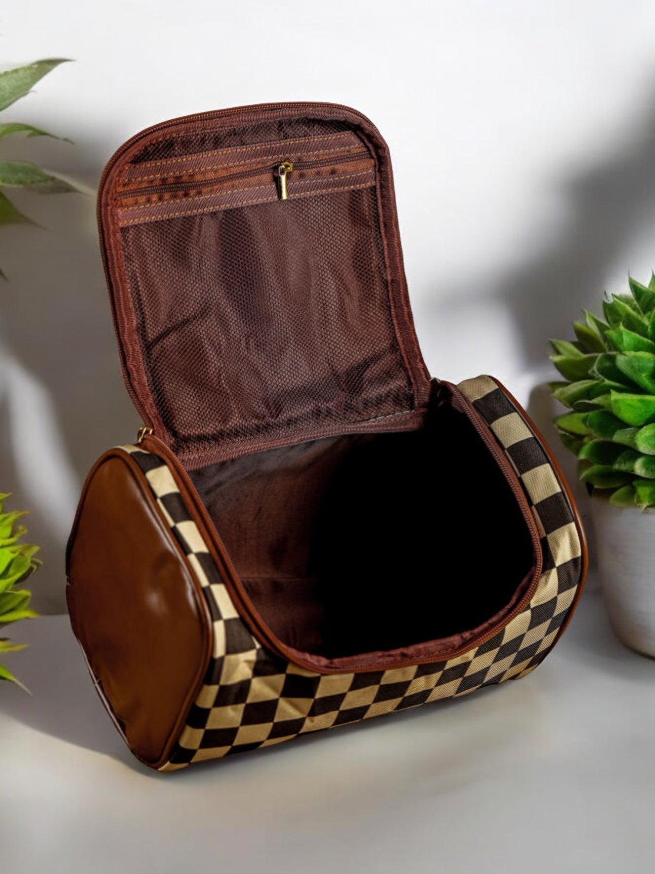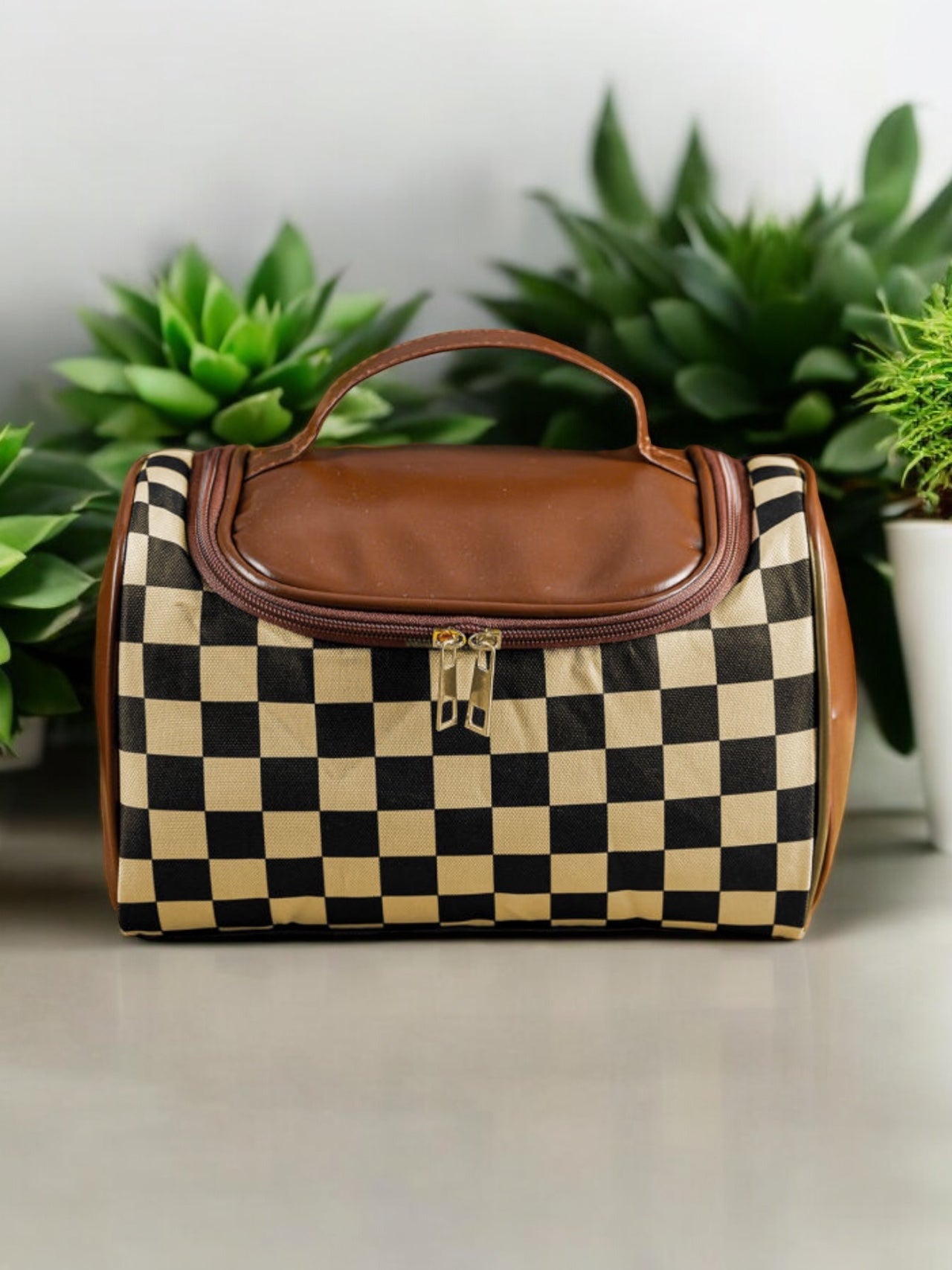 This sleek black and cream checkered print makeup bag is the perfect organizer for all your beauty products. Keep your essentials in one place, making it easy to access and travel with. Stay stylish and organized with this functional and chic makeup bag.