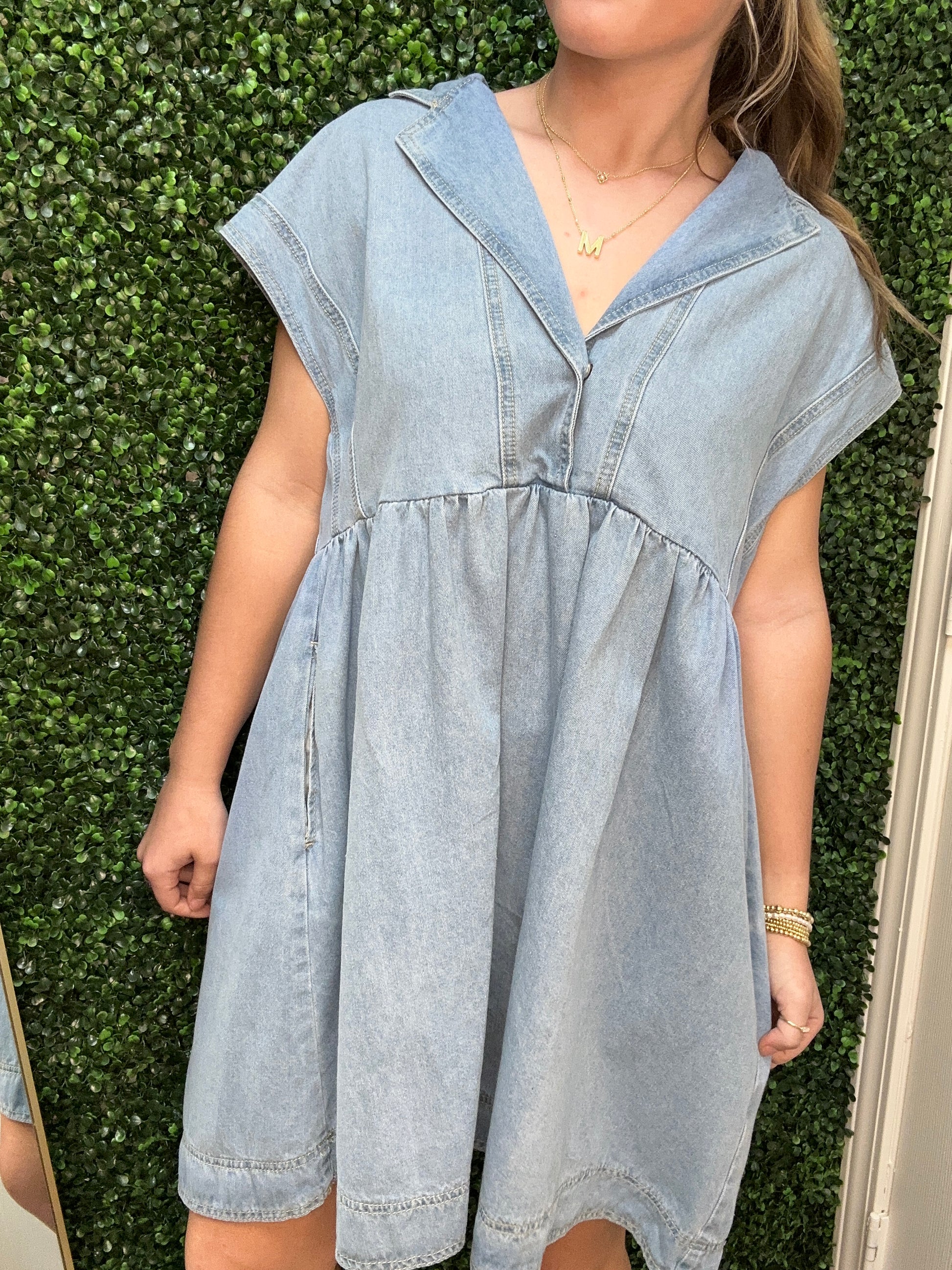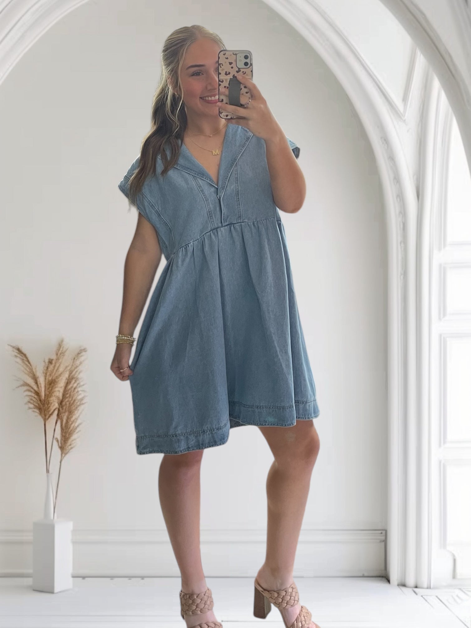 Introducing the Sunshine Denim Dress, perfect for rodeo season! This versatile dress pairs beautifully with boots and accessories and can even be layered with a mesh bodysuit for a unique look. Yee Ha!